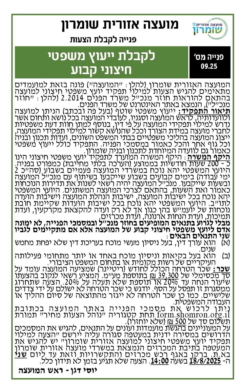 | שם המכרז | פנייה לקבלת הצעות לקבלת ייעוץ משפטי חיצוני קבוע |